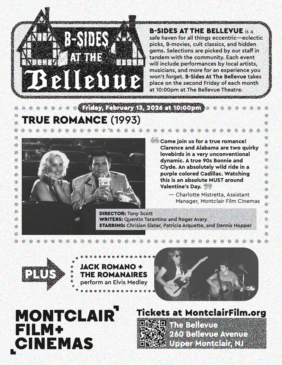 <p><span>February 13 Only!<br>Featuring a Live Pre-Show by Jack Romano and the Romanaires Performing an Elvis Medley!<br></span></p><p><span>In this passionate, hard-edged story, two unlikely lovers, Clarence Worley (Christian Slater) and Alabama (Patricia Arquette), double-cross the Detroit mob by unwittingly stealing a load of valuable contraband. The couple flees to Los Angeles, where their plan to sell the goods and vanish together forever sets them on a collision course with both gangsters and police.<br>Programmed by Charlotte Mistretta<br></span></p><p><span>“Come join us for a true romance! Clarence and Alabama are two quirky lovebirds in a very unconventional dynamic. A true 90s Bonnie and Clyde. An absolutely wild ride in a purple colored Cadillac. Watching this is an absolute MUST around Valentine’s Day.”- Charlotte Mistretta, Assistant Manager, Montclair Film Cinemas<br></span></p><p style="text-align: center"><span>Playing in our New Late Night Series </span><strong><span>B-Sides At The Bellevue.</span></strong></p>