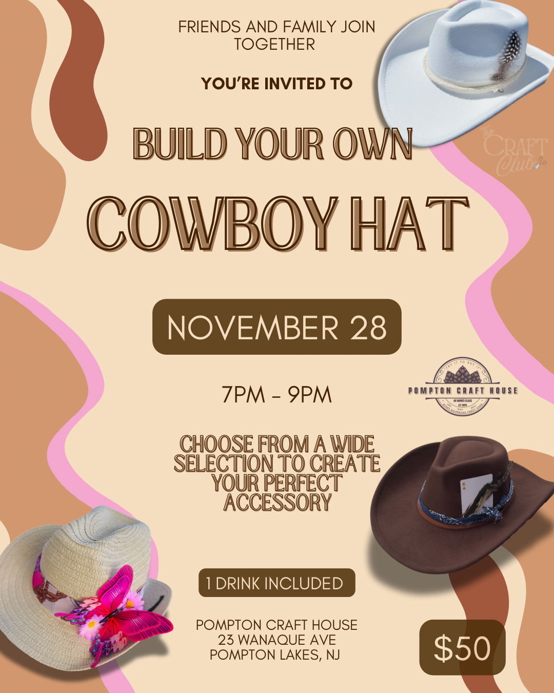 <p>Take the family out for some fun with<strong> The Craft Club </strong>and <strong>Decorate your own </strong>cowboy hat with a selection of accessories and adornments. We will have multiple size and style options available for you to try out. One drink included with ticket purchase. See you there, <strong>YEEHAW!!</strong></p>
