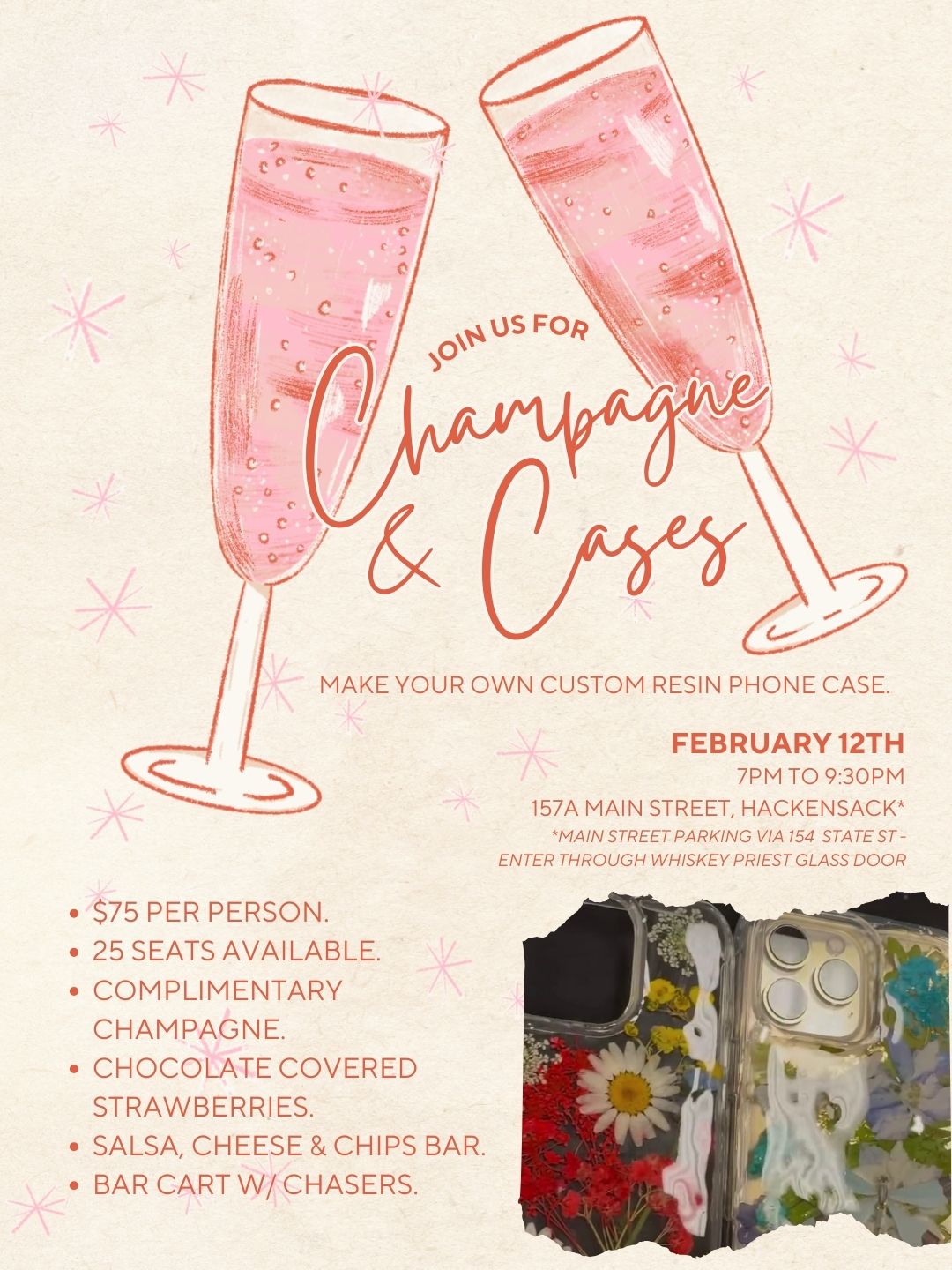 <p><span>Champagne & Cases (Creative Pour Class) ✅</span></p><p><span>💖</span><strong><span> V-Day Edition</span></strong><span> 💖</span></p><p><span>✨ </span><em><span>Make your own custom RESIN phone case</span></em><span> ✨</span></p><p></p><p><span>Grab your girls, your boo, or come solo and vibe with us 💋</span></p><p><span>We’re bringing the vibes, the pours, and the creativity.</span></p><p></p><p><span>📍 </span><strong><span>The Hub Studios</span></strong></p><p><a target="_blank" rel="noopener noreferrer nofollow" href="x-apple-data-detectors://embedded-result/266"><span>157A Main Street</span></a><span>, Hackensack</span></p><p><span>(Main Street parking or rear entrance via 154 State St — enter through the Whiskey Priest glass door)</span></p><p></p><p><span>🗓 </span><strong><span>February 12th</span></strong></p><p><span>⏰ </span><strong><span>7PM – 9:30PM</span></strong></p><p><strong><span>$75 per person</span></strong></p><p><strong><span>25 Seats Available Only!</span></strong></p><p></p><p></p><p><span>🍾 </span><strong><span>What’s included:</span></strong></p><p><span>• Complimentary champagne</span></p><p><span>• Chocolate-covered strawberries</span></p><p><span>• Salsa & cheese chips bar</span></p><p><span>• Full bar cart (Ice, cups, napkins)</span></p><p><span>• Chasers: OJ, Pineapple Juice, Red Bull</span></p><p><span>• Music all night</span></p><p><span>• Your own instructor + party host</span></p><p><span>• A welcome pour as soon as you walk in 🥂</span></p><p></p><p><span>Come create, sip, laugh, and leave with a custom phone case made by </span><strong><span>YOU</span></strong></p><p><span>We can’t wait to host you 💕</span></p><p></p><p><strong><span>LINK IN BIO</span></strong></p><p><span>#TheHubStudios #VDayVibes #CreativePour #SipAndCreate #ResinArt #ValentinesMonth #GirlsNightOut #HackensackEvents</span></p>