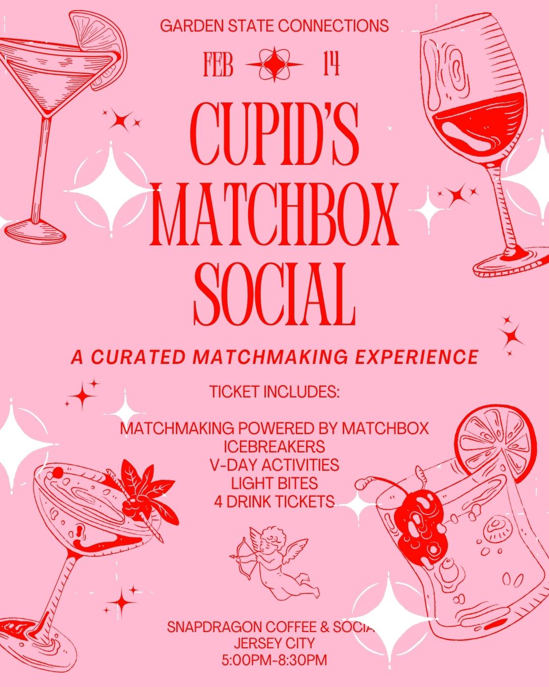 <p><span></span><em><span>Includes: a room full of singles, matching powered by Matchbox</span></em><span>.</span></p><p><span></span><strong><span>Are you ready for Cupid's Matchbox Social?</span></strong><span> Join us for a singles-mixer and matchmaking event powered by Matchbox — answer a fun questionnaire, mingle with other guests, then get matched in real time using Matchbox’s algorithm based on values/interests.</span></p><p><span></span><strong><span>Match making will be powered by Matchbox</span></strong><span>. It’s a software that uses relationship science to find you your most compatible match at the party. The algorithm has matched more than half a million people to date, across 40 countries. It optimizes for long-term compatibility, based on values—but it’s up to you to see if you’ll click.</span></p><p><span></span><strong><span>How it works:</span></strong></p><ul><li><p><span>Upon arrival, you’ll take a matching questionnaire built by Matchbox's team of relationship scientists and curated by your host.</span></p></li><li><p><span>The Matchbox algorithm will identify your optimal match at the party, based on relationship science, AI, and Nobel Prize-winning economics.</span></p></li><li><p><span>After mingling with the whole group, matches are revealed!</span></p></li></ul><p><span></span><strong><span>Ticket Includes:</span></strong></p><ul><li><p><span>A room full of singles, matching powered by Matchbox.</span></p></li><li><p><span>Icebreaker activities</span></p></li><li><p><span>An assortment of light appetizers</span></p></li><li><p><span>4 drink tickets to the bar</span></p></li><li><p><span>Missed Connections</span></p></li></ul><p><span></span><strong><span>Who it’s for:</span></strong></p><ul><li><p><span>This event is for people ages 25-45</span></p></li></ul><p><span></span><strong><span>What to expect:</span></strong></p><ul><li><p><span>Matchbox’s team of relationship researchers spent years crafting questions that uncover what actually matters in long-term compatibility. Their algorithm focuses on deep values and meaningful connection, giving you a solid foundation from the start.</span></p></li><li><p><span>And remember — not every match begins with fireworks! Some start with a smile, a good joke, or simply great conversation.</span></p></li><li><p><span>At the end of the night, you’ll have met a wonderful group of singles. Be open, be curious, and be kind.</span></p></li></ul><p><span></span><strong><span>Event Structure:</span></strong></p><ul><li><p><span>Our matching experience is carefully timed to keep the energy flowing. Arrive on time so you can be part of the full journey!</span></p><ul><li><p><span>🕔 5:00pm—the event begins on time, questionnaires begin</span></p></li><li><p><span>📝 5:45pm—doors close, The Algorithm begins computing matches</span></p></li><li><p><span>💬 Before 6:00pm—casual mingling</span></p></li><li><p><span>🔍 7:00pm—a series of clues</span></p></li><li><p><span>❤️🔥 7:30pm—1st match revealed</span></p></li><li><p><span>💘 7:45pm—2nd match revealed</span></p></li><li><p><span>💞 8:00pm—3rd match revealed</span></p></li><li><p><span>✨ 8:30pm—event concludes</span></p></li></ul></li></ul><p><span></span><strong><span>FAQs:</span></strong></p><p><span></span><strong><span>Q: What age range is the event for?</span></strong><span> A: This event is for mid-twenties to mid-forties.</span></p><p><span></span><strong><span>Q: What if I don't get a match?</span></strong><span> A: We aim to maintain a 50/50 male to female ratio but cannot guarantee that all attendees will show up, as life happens. If there is an uneven split, some matches will be paired platonically. These people receive a free ticket to a future event of their choice, valid for 1 year after this event.</span></p><p><span></span><strong><span>Q: How are the questions chosen? </span></strong><span>A: Matchbox has a team of relationship science researchers who study what questions are important for predicting long-term compatibility. They’ve written thousands of possible questions over the years. Your host has selected 20-30 of their favorite questions to build your particular questionnaire.</span></p><p><span></span><strong><span>Q: How does The Algorithm work? </span></strong><span>A: The Matchbox Algorithm is designed to match you with someone you’re compatible with deep down. It’s up to you to see if you click. But if you do, the long term is taken care of. The Algorithm will give you your best match at the event—subject to everyone else also needing to get exactly one match.</span></p><p><span></span><strong><span>Q: What’s behind the research? </span></strong><span>A: Early research happened through an organization called the Marriage Pact, which runs an event for 100,000s of students at colleges around the country every year. It’s called “the marriage pact” because it was designed to introduce participants to their “optimal marital backup plan”. They may not be Prince Charming, but they </span><em><span>will</span></em><span> be a practical choice—someone who you could spend a </span><em><span>great</span></em><span> 50 years with. Matchbox takes the technology and research behind the Marriage Pact and brings it to life for the rest of us.</span></p><p><span></span><strong><span>Q: What is your refund policy? </span></strong><span>A:</span><strong><span> </span></strong><span>There will be NO refunds for this event. If you bought a ticket and are no longer able to come, please contact us ASAP! </span><a target="_blank" rel="noopener noreferrer nofollow" href="mailto:gardenstateconnections@gmail.com"><span>gardenstateconnections@gmail.com</span></a></p>