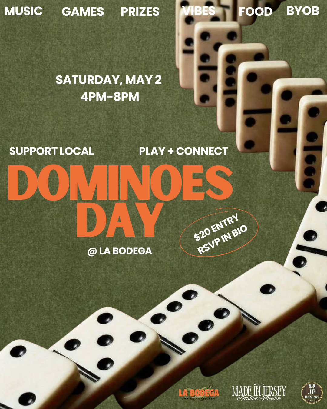 <p><span>Dominoes, music, food & vibes. BYOB and pull up for a high-energy day of games, connection, community & raffle prizes.</span></p><p><span>An intentional day of connection, culture, and good energy — with a little friendly competition on the side.</span></p><p><span>Join us for </span><strong><span>Dominoes Day</span></strong><span> with Made in Jersey Creative Collective — where community meets vibes.</span></p><p><span>This isn’t just a game day. It’s a space to kick back, connect, and tap into that nostalgic, feel-good energy — whether you’re here to play, network, support local restuarant or just enjoy the atmosphere.</span></p><p><span>From the sound of dominoes hitting the table to music setting the tone, this is about bringing people together in a way that feels natural, easy, and real.</span></p><p><span>Expect a lively, welcoming environment. Good music. Great people. Games that spark conversation. And moments that turn into memories.</span></p><p><span style="color: rgb(88, 81, 99)"><span>Expect:</span></span><span><br></span><span style="color: rgb(88, 81, 99)"><span>🎶 Music + high energy atmosphere</span></span><span><br></span><span style="color: rgb(88, 81, 99)"><span>🁢 Dominoes + games</span></span><span><br></span><span style="color: rgb(88, 81, 99)"><span>🍽️ Food to keep you going</span></span><span><br></span><span style="color: rgb(88, 81, 99)"><span>🎟️ Raffle prizes throughout the day</span></span><span><br></span><span style="color: rgb(88, 81, 99)"><span>🤝 Organic, no-pressure connections</span></span></p>