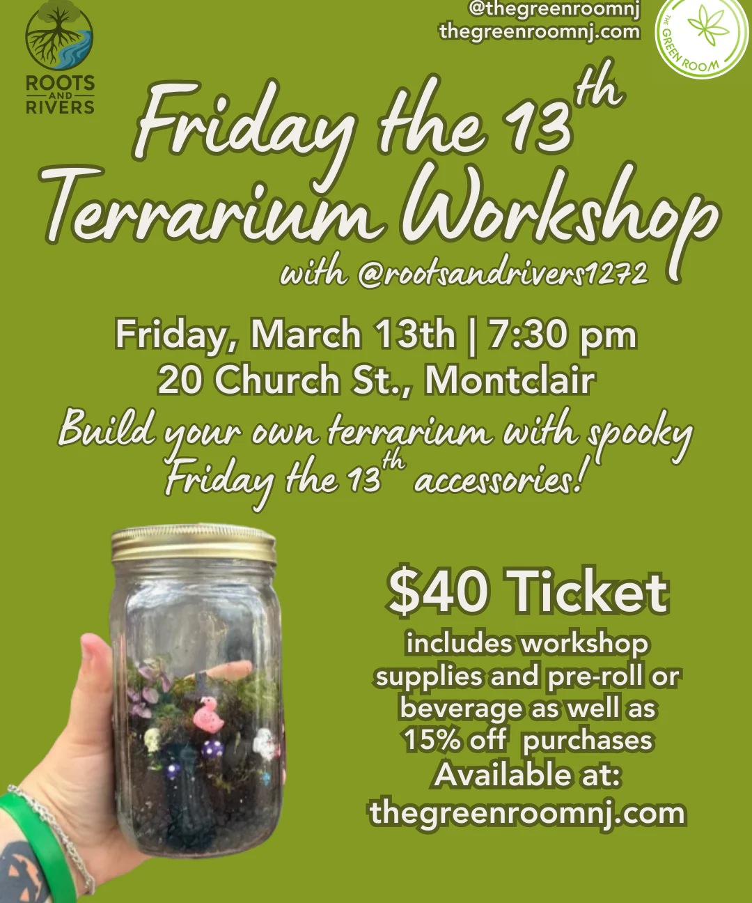 <p>ROOTS</p><p>- AND</p><p>RIVERS</p><p>Friday the 13</p><p>th</p><p>Terrarium Workshop</p><p>with @rootsandrivers1272</p><p>Friday, March 13th | 7:30 pm</p><p>20 Church St., Montclair</p><p>Build your own <strong>terrarium</strong> with spooky<strong> </strong>Friday the 13Th accessories.</p><p>$40 Ticket includes workshop supplies and pre-roll or beverage as well as</p><p>15% off purchases</p>