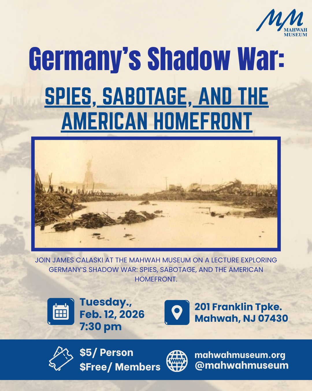 <p><strong><em><span>Thursday, February 12, 2026, 7:30 pm.</span></em></strong></p><p><span style="color: inherit"><span> Join James Calaski at the Mahwah Museum on a lecture exploring Germany's Shadow War: Spies, Sabotage, and the American Homefront.</span></span></p><p><span style="color: inherit"><span>Get ready for a gripping dive into the shadows of WWI, right here on American soil! Calaski uncovers the shocking truth about German espionage and sabotage in the US. Discover the clandestine battle waged by Imperial Germany's spy network, designed to cripple American industry and undermine neutrality.</span></span></p><p><span style="color: inherit"><span>He’ll expose the chilling details of the Black Tom Explosion, a catastrophic blast that rocked New York Harbor, and the Kingsland Explosion, another act of calculated sabotage. This isn't just history; it's a pulse-pounding tale of undercover agents, daring plots, and the desperate fight to protect a nation on the precipice of war. Don't miss this thrilling exploration of a forgotten front!</span></span></p><p><strong><span>About the speaker</span></strong><span>: James Calaski is a historian, speaker, researcher, writer, and genealogist.</span></p><p style="text-align: left"><span>Any necessary information will be sent to the email you provide.</span></p><p style="text-align: left"><strong><span>No physical ticket will be required or distributed.</span></strong></p><p style="text-align: left"><span>Museum admission: </span><strong><span>Members:</span></strong><span> Free with discount code – </span><strong><span>Non-Members:</span></strong><span> $5<br></span><em><span>Not sure you're a member? </span></em><span>Contact us at </span><a target="_blank" rel="noopener noreferrer nofollow" href="mailto:mahwahmuseum@gmail.com"><span>mahwahmuseum@gmail.com</span></a><span> to find out.</span></p>