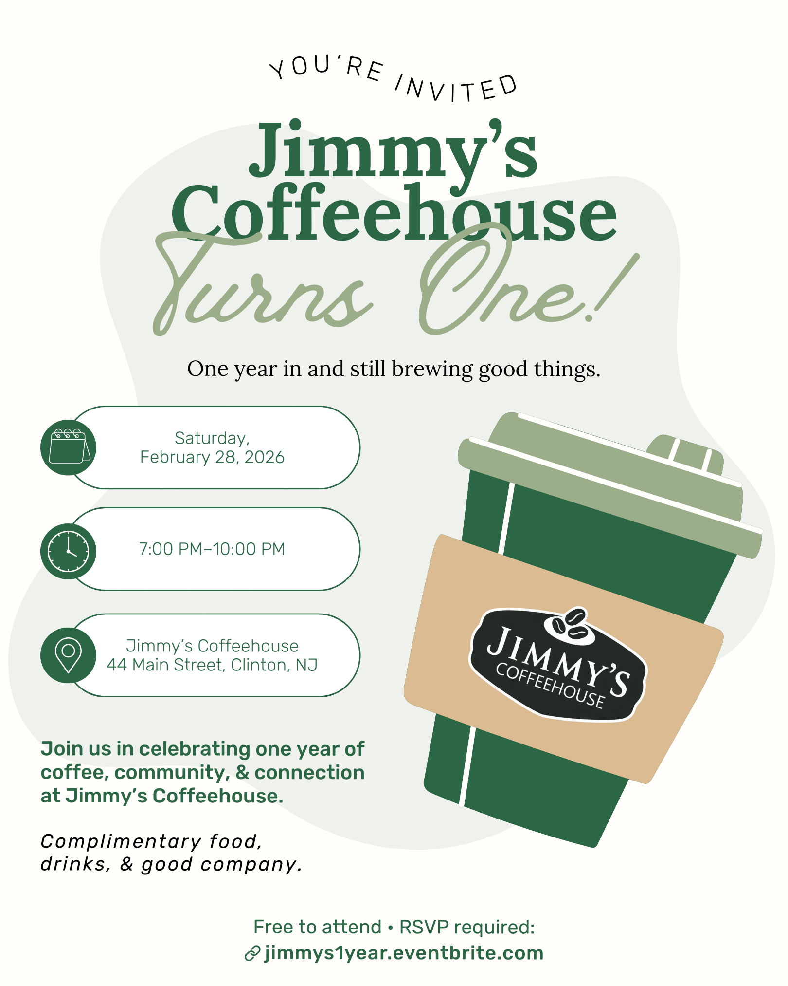 <h2><strong><span style="font-size: 18px">Jimmy’s Coffeehouse turns one! Join the Clinton community for food, drinks, and great company in celebration of our first anniversary.</span></strong></h2><p><span style="font-size: 18px">One year in and still brewing good things—and we couldn’t have done it without you. We’re hosting a celebration to thank our neighbors, regulars, and everyone who has supported </span><a target="_blank" rel="nofollow noopener noreferrer" href="https://jimmyscoffeehouse.com/"><span style="font-size: 18px">Jimmy’s Coffeehouse</span></a><span style="font-size: 18px"> this past year. Join us in celebrating one year of coffee, community, and connection!</span></p><ul><li><p><span style="font-size: 18px"><u>Date:</u> Saturday, February 28, 2026</span></p></li><li><p><span style="font-size: 18px"><u>Time:</u> 7:00–10:00 PM</span></p></li><li><p><span style="font-size: 18px"><u>Place:</u> Jimmy’s Coffeehouse (44 Main Street, Clinton, New Jersey 08809)</span></p></li></ul><p><span style="font-size: 18px">Located on Main Street overlooking downtown Clinton’s iconic Red Mill Museum Village and waterfall, Jimmy’s has become a special gathering place for locals and visitors alike. To mark this milestone, we invite you to a community event in the heart of Hunterdon County.</span></p><p><span style="font-size: 18px">Whether you’ve been with us since day one or are visiting for the first time, we can’t wait to celebrate this milestone with you. Come raise a mug and toast to one year of Jimmy’s Coffeehouse in Clinton.</span></p><p></p><h3><strong><span style="font-size: 18px">Event Highlights</span></strong></h3><ul><li><p><span style="font-size: 18px">Complimentary hors d’oeuvres, refreshments, and desserts served buffet-style starting at 7 PM</span></p></li><li><p><span style="font-size: 18px">Scenic views of Main Street, the Red Mill, and the waterfall</span></p></li><li><p><span style="font-size: 18px">A chance to mingle with Jimmy’s community</span></p></li><li><p><span style="font-size: 18px">The celebration continues after 10 PM for guests 21+</span></p></li></ul><p></p><h3><strong><span style="font-size: 18px">Important Details</span></strong></h3><ul><li><p><span style="font-size: 18px">This is a </span><strong><span style="font-size: 18px">free event</span></strong><span style="font-size: 18px">, but </span><strong><span style="font-size: 18px">RSVP is required</span></strong><span style="font-size: 18px"> here: </span><a target="_blank" rel="noopener noreferrer nofollow" href="https://jimmys1year.eventbrite.com/"><span><span>jimmys1year.eventbrite.com</span></span></a></p></li><li><p><span style="font-size: 18px">Complimentary food and beverages will be provided buffet-style beginning at </span><strong><span style="font-size: 18px">7 PM</span></strong><span style="font-size: 18px">. We recommend arriving closer to the start of the event if you’d like to enjoy the food.</span></p></li><li><p><span style="font-size: 18px">Jimmy’s standard café menu will be closed during the event.</span></p></li><li><p><strong><span style="font-size: 18px">If you have any questions</span></strong><span style="font-size: 18px">, we encourage you to read our </span><strong><span style="font-size: 18px">FAQ section below</span></strong><span style="font-size: 18px">, or contact </span><a target="_blank" rel="noopener noreferrer nofollow" href="jimmycoffeehouse@gmail.com"><span style="font-size: 18px">jimmycoffeehouse@gmail.com</span></a><span style="font-size: 18px"> via email to reach us directly.</span></p></li></ul><p></p><h3 style="text-align: left"><strong><span>Anniversary Giveaway</span></strong></h3><p style="text-align: left"><span>We’ll be hosting a $50 Instagram giveaway in celebration of our one-year anniversary. Follow us on Instagram </span><a target="_blank" rel="nofollow noopener noreferrer" href="http://instagram.com/jimmycoffeehouse"><span><u>@jimmycoffeehouse</u></span></a><span> to stay in the loop and enter to win a gift card to Jimmy’s.</span></p><p style="text-align: left"></p><h3 style="text-align: left"><strong><span>Help Us Spread the Word</span></strong></h3><p style="text-align: left"><span>Help us spread the word by sharing this event page and the event flyer below! You can also invite your friends and loved ones directly through our </span><a target="_blank" rel="nofollow noopener noreferrer" href="https://www.facebook.com/share/19TTYjJzgW/"><span><u>Facebook event page</u></span></a><span> to help grow the guest list. Your support helps us reach more people and makes this community celebration even more special. Thank you for celebrating alongside us and for being part of our story!</span></p>