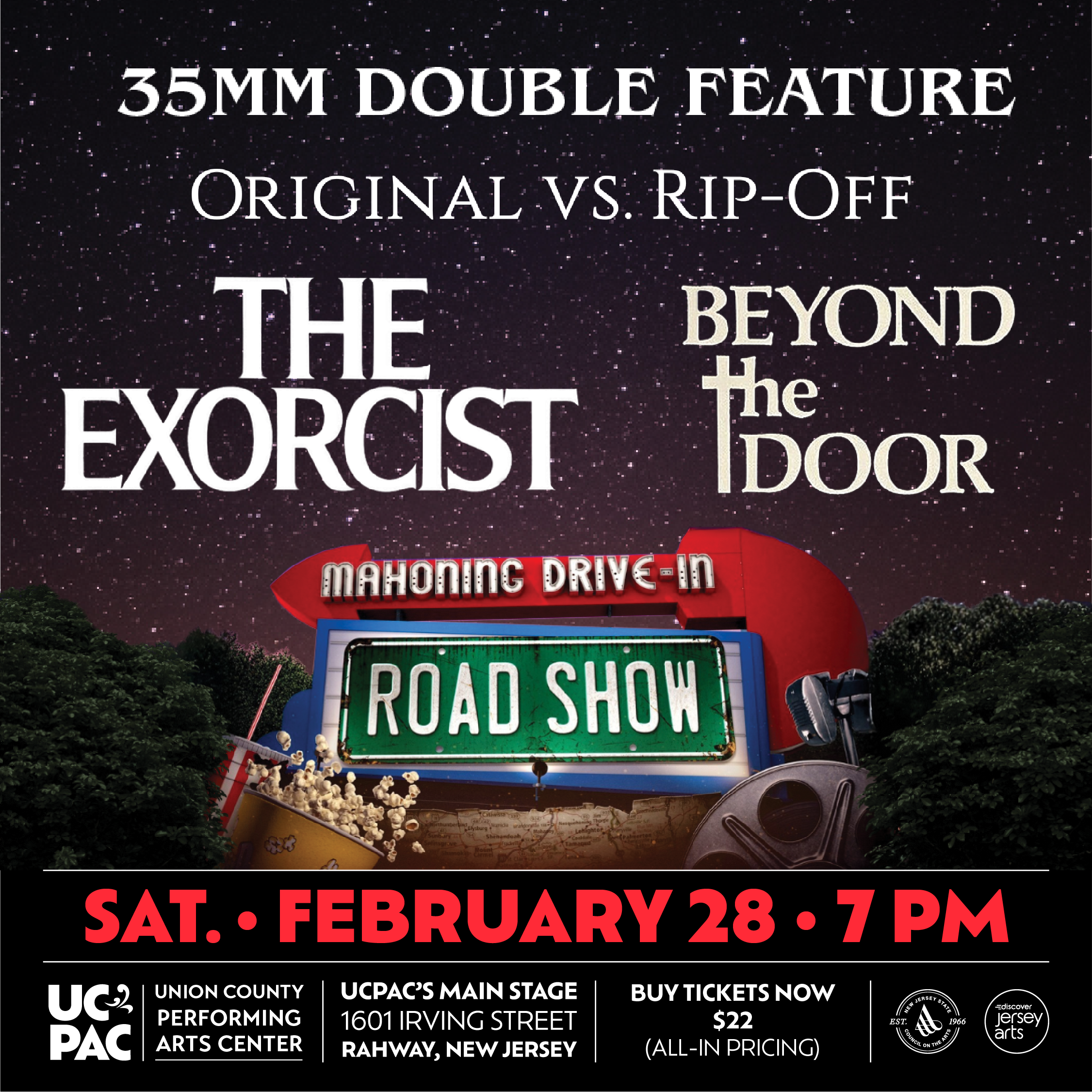 <p><span><span>The Mahoning Drive-In Road Show hits the road, migrating the vibes of the Drive-In indoors for the winter. This year's event at UCPAC's Main Stage features a 1970s 35mm “Original/Rip-Off” double feature of “The Exorcist” (1973) and “Beyond the Door” (1974)! Join Virgil and Mark from Pennsylvania’s 35mm movie mecca The Mahoning Drive-In Theater for an indoor night at the Drive-In, complete with vintage snack bar ads, trailers, and an intermission reel between the films! They will introduce the show, talk about the history of Drive-In theaters, the Mahoning Drive-In, and give a little insight into the two shockers about to be unspooled; then it’s 35mm madness unleashed upon the giant screen at UCPAC’s Main Stage!</span></span></p>