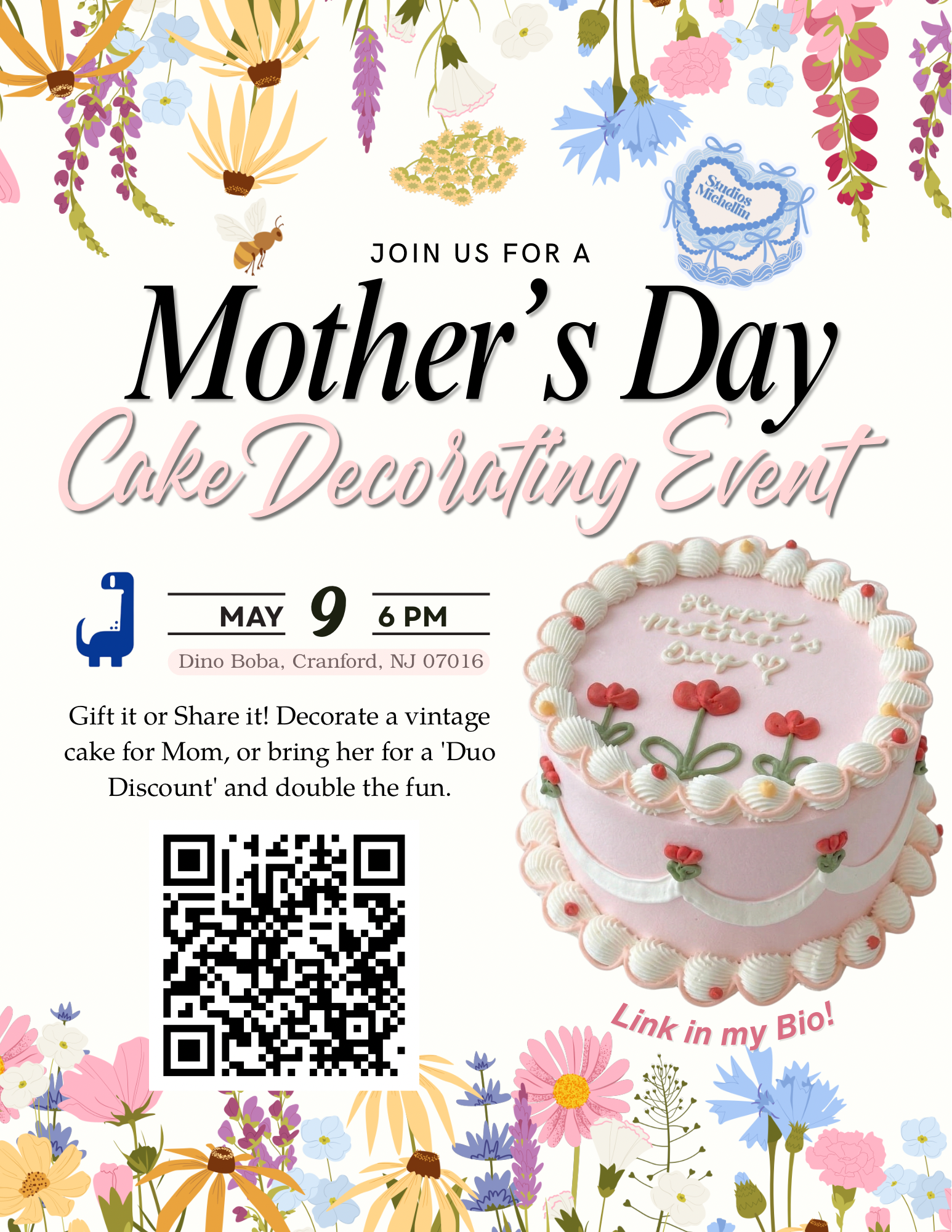 <h2><span>🌸 Mother’s Day Pop-Up: Vintage Cake Decorating</span></h2><p><span>Celebrate Mom with a touch of sweetness and style! Join </span><strong><span>Studios Michellin</span></strong><span> at </span><strong><span>Dino Boba</span></strong><span> for an exclusive, beginner-friendly workshop. Whether you’re crafting the perfect gift or spending the evening creating memories together, it’s the ultimate Mother’s Day experince.</span></p><p><span>Expect a creative party—vibe to feel-good hits, sip on fresh boba, and get lost in the art of vintage piping. No experience? No problem! It's all about having fun and celebrating the moms we love.</span></p><hr><h3><span>✨ What’s Included:</span></h3><ul><li><p><strong><span>Two-Layer Cake:</span></strong><span> Freshly baked and ready to decorate.</span></p></li><li><p><strong><span>Complimentary Drink:</span></strong><span> One signature Dino Boba drink of your choice.</span></p></li><li><p><strong><span>Pro Materials:</span></strong><span> All buttercream, piping bags, and tools provided.</span></p></li><li><p><strong><span>Expert Tips:</span></strong><span> Step-by-step guidance on vintage ruffles and borders.</span></p></li><li><p><strong><span>Cake Box:</span></strong><span> To take your masterpiece home!</span></p></li></ul><p><span>🎟️ </span><strong><span>Ticket Options:</span></strong></p><ul><li><p><strong><span>Single Guest:</span></strong><span> $60 (Includes one cake + one complimentary boba drink)</span></p></li><li><p><strong><span>Mom Bundle (Save $15!):</span></strong><span> $105 for 2 guests. Bring Mom or a friend and you each get two separate cakes, two drinks, and all materials to decorate together!</span></p></li></ul><p><span>📍 </span><strong><span>Event Details:</span></strong></p><ul><li><p><strong><span>Date:</span></strong><span> Saturday, May 9, 2026 | 6:00 PM – 8:00 PM</span></p></li><li><p><strong><span>Location:</span></strong><span> Dino Boba, 21-23 N Union Ave, Cranford, NJ</span></p></li></ul>