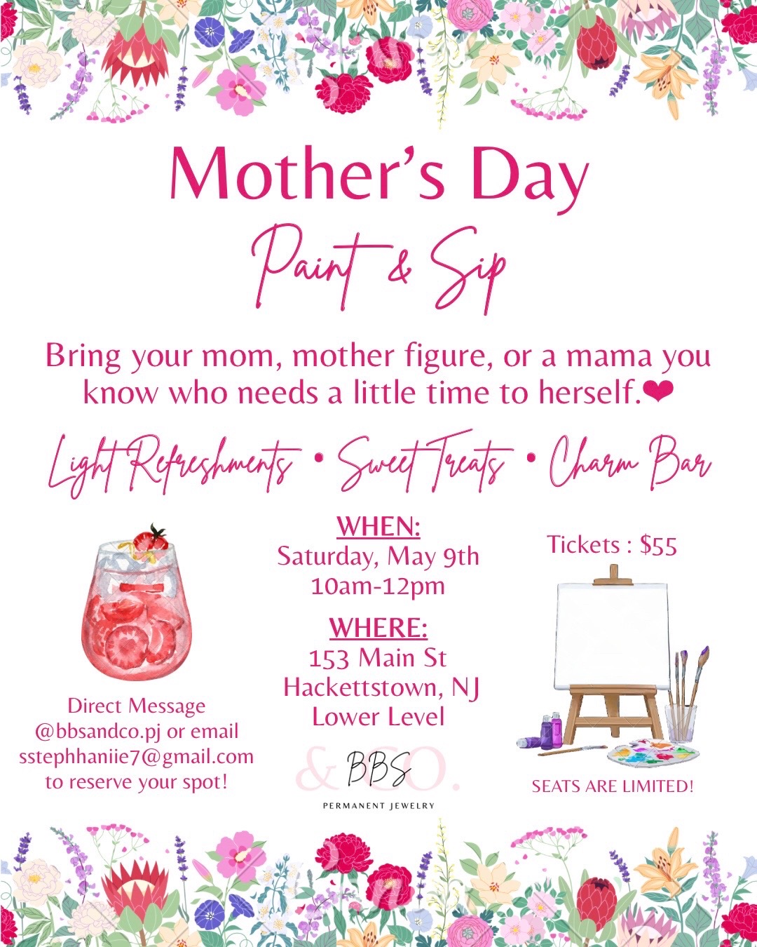 <p>The next Paint & Sip is finally here!🎨✨</p><p>Bring your mama, mom figure, or that special someone who you know just needs a little me time.💓</p><p>Tickets include all painting materials, sweet treats and a drink of your choice from our menu!</p><p>Direct Message @bbsandco.pj on Instagram or email <a target="_blank" rel="noopener noreferrer nofollow" href="mailto:sstephhaniie7@gmail.com">sstephhaniie7@gmail.com</a> to reserve your spot.</p><p>Tickets are LIMITED!🎟️</p>