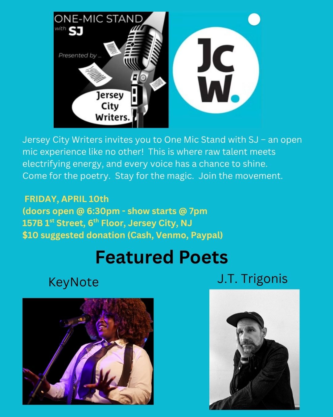 <p><span>Step up. Speak out. Stand tall.</span></p><p><span>Jersey City Writers invites you to One-Mic Stand with SJ—an open mic experience like no other! This is where raw talent meets electrifying energy, and every voice has a chance to shine.</span></p><p><span>On the 2nd Friday of every month, two incredible featured poets will take the stage alongside a lineup of fearless performers from our vibrant poetry community. Open mic slots are 5 minutes each, giving you the perfect space to share your truth—whether it’s poetry, spoken word, or a story waiting to be heard.</span></p><p><span>Come for the poetry. Stay for the magic. Join the movement.</span></p><p><span>$10 Suggested Donation (Cash, Venmo, Paypal)</span></p><p><span>Doors open at 6:30pm, Open Mic starts at 7pm -- first come, first served!</span></p><p><span>Our Host Steve Willett (SJ) is a sound poet who is actively involved in the poetry community and has had several feature performances around New Jersey. His poem ‘Petulance’ was a shortlisted selection for the University of Grimsby’s Hammond House International Poetry Competition in 2019. Steve serves as moderator for the Jersey City Writers (JC Plums) poetry group, which meets online every week to discuss poetry and improve participants' works. He was also one of the producers for the Jersey City Writers JC Poetry Festival in 2023 and is currently working on the 2025 festival. He is also a teaching artist at Newark School of the Arts. He lives with his wife, 2 daughters, and 5 cats in the Heights. He is excited to have his own Open Mic, (One-Mic Stand with SJ), and give back to a community that has given so much support to him.</span></p><p><span>02/13 FEATURED ACTS: KeyNote & J.T. Trigonis</span></p><p><span>KeyNote is a poet and performer born and raised in Paterson, NJ. She began writing at the early age of 12; eventually self-publishing her first book, “Mind of A Mature Youngin ‘’ at age 16. She continued her passion for the art in college as Vice President of Kean University’s Poetry Club, where she earned her BA in Psychology and MA in Forensic Psychology. KeyNote has been a featured poet, guest poet, and slam competitor at 40+ events across NJ, NY, and Philly. She is also the 2024 Winner of the New Jeru Send-Off Slam and earned her spot on the 2025 team going on to compete nationally. Now, KeyNote is focused on growing her craft, curating OutCry the Slam in Newark, KeyNote Speakers Social Event in Paterson, and co-hosting Cozy Keys in Union City, NJ.</span></p><p><span>J.T. Trigonis (he/him) is a neon troubadour of the written word. With the obligatory MFA in poetry from Brooklyn College and the ever more obligatory Pushcart prize nomination, his work has appeared in nearly 60 journals that have graced the bottom shelf of book stands (and online, too) for nearly 30 years. He’s headlined at over 30 venues, and he’s the author of seven self-published chapbooks. His most recent chapbook of selected poems, Through the Wreckage, was released in 2026 by Finishing Line Press.<br>Trigonis plays master of ceremonies at WAYE (We Appreciate Your Enthusiasm), the popular monthly reading series he and his partner host at their vintage shop/used bookstore in Jersey City Heights, and he’s the editorial director of By the WAYE, a magazine of poetry and visual art.</span></p><p><span>Supported by public funds from the Jersey City Arts and Culture Trust Fund</span></p>