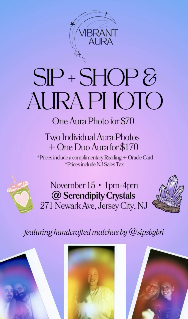 <p><span style="color: rgb(245, 245, 245)"><span>Sip + Shop at </span></span><a target="_blank" rel="noopener noreferrer nofollow" class="x1i10hfl xjbqb8w x1ejq31n x18oe1m7 x1sy0etr xstzfhl x972fbf x10w94by x1qhh985 x14e42zd x9f619 x1ypdohk xt0psk2 x3ct3a4 xdj266r x14z9mp xat24cr x1lziwak xexx8yu xyri2b x18d9i69 x1c1uobl x16tdsg8 x1hl2dhg xggy1nq x1a2a7pz notranslate _a6hd" href="https://www.instagram.com/jerseycitycrystals/?hl=en"><span>@jerseycitycrystals</span></a><span style="color: rgb(245, 245, 245)"><span> on November 15! Handcrafted matchas by </span></span><a target="_blank" rel="noopener noreferrer nofollow" class="x1i10hfl xjbqb8w x1ejq31n x18oe1m7 x1sy0etr xstzfhl x972fbf x10w94by x1qhh985 x14e42zd x9f619 x1ypdohk xt0psk2 x3ct3a4 xdj266r x14z9mp xat24cr x1lziwak xexx8yu xyri2b x18d9i69 x1c1uobl x16tdsg8 x1hl2dhg xggy1nq x1a2a7pz notranslate _a6hd" href="https://www.instagram.com/sipsbybri/?hl=en"><span>@sipsbybri</span></a><span style="color: rgb(245, 245, 245)"><span>. Crystal shopping at </span></span><a target="_blank" rel="noopener noreferrer nofollow" class="x1i10hfl xjbqb8w x1ejq31n x18oe1m7 x1sy0etr xstzfhl x972fbf x10w94by x1qhh985 x14e42zd x9f619 x1ypdohk xt0psk2 x3ct3a4 xdj266r x14z9mp xat24cr x1lziwak xexx8yu xyri2b x18d9i69 x1c1uobl x16tdsg8 x1hl2dhg xggy1nq x1a2a7pz notranslate _a6hd" href="https://www.instagram.com/jerseycitycrystals/?hl=en"><span>@jerseycitycrystals</span></a><span style="color: rgb(245, 245, 245)"><span>. Aura photos by Vibrant Aura! Support three small women owned businesses in one stop.</span><strong><span> </span></strong></span><span><br><br></span><strong><span>VIBRANT </span></strong><span style="color: rgb(245, 245, 245)"><span>AURA PHOTO PROCESS:</span></span><span><br></span><span style="color: rgb(245, 245, 245)"><span>It's easy! You show up with your amazing energy and Vibrant Aura takes your portrait. While we wait for the film to develop, we pull an oracle card with a message from the universe. š® Finally, we do a reading of the specific colors in the portrait and their meaning and you leave the experience with the film copy of the portrait and a color card that describes what all of the colors mean. š</span></span><span><br><br></span><span style="color: rgb(245, 245, 245)"><span>āØSerendipity Crystals (271 Newark Ave, Jersey City, NJ)</span></span><span><br></span><span style="color: rgb(245, 245, 245)"><span>āØAppointments encouraged, walk-ins welcome. Book your spot with the link in bio! Payment is required upon booking to secure your time slot.</span></span><span><br></span><span style="color: rgb(245, 245, 245)"><span>āØNovember 15, 1-4pm</span></span></p>
