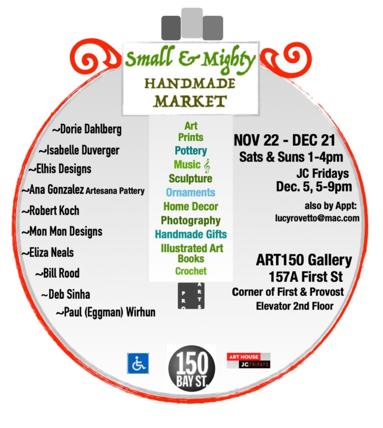 <h2><strong>🎁 </strong>Small & Mighty Handmade Market <strong>Returns to Jersey City This Holiday Season</strong></h2><p><strong>🗓️ November 22 – December 21, 2025</strong><br>📍 <strong>ART150 Gallery</strong> – 157A First<strong> </strong>Street, Jersey City, NJ<br>🕰️ Saturdays & Sundays 1–4 PM | <strong>JC Fridays</strong> Night Market: Dec. 5, 5–9 PM<br>💌 Private appointments available: <a target="_blank" rel="noopener noreferrer nofollow" href="mailto:lucyrovetto@mac.com">lucyrovetto@mac.com</a></p><hr><h3>✨ Big heart. Small business. Mighty gifts.</h3><p>Back for the 2025 holiday season, the <strong>Small & Mighty Handmade Market</strong> transforms <strong>ART150 Gallery</strong> in Jersey City into a cozy wonderland of locally made art, gifts, and crafts. Featuring work by talented NJ artists and makers — from pottery to prints, ornaments to crochet — this annual pop-up is your one-stop shop for meaningful, handmade holiday treasures.</p><p>Curated with care, the market lineup includes:</p><ul><li><p>🎨 Art & Prints</p></li><li><p>🧵 Crochet, Illustrated Books, Home Decor</p></li><li><p>🪴 Pottery & Sculpture</p></li><li><p>📸 Photography & Handmade Gifts</p></li><li><p>🎄 Ornaments & Music</p></li><li><p>✍️ Work by artists like Mon Mon Designs, Ana Gonzalez, Elhis Designs, and more.</p></li></ul><p>Located on the <strong>2nd floor of 157A First Street (corner of First & Provost)</strong>, the gallery is fully accessible and filled with festive spirit — especially during <strong>JC Fridays on December 5</strong> when the market stays open late for a magical night of shopping and music.</p><hr><h3>🎨 Why It’s On Our Radar:</h3><p>Because shopping small should feel big. This market isn’t just about checking people off your list — it’s about finding gifts with soul, supporting local artists, and giving back to the creative heartbeat of Jersey City.</p>