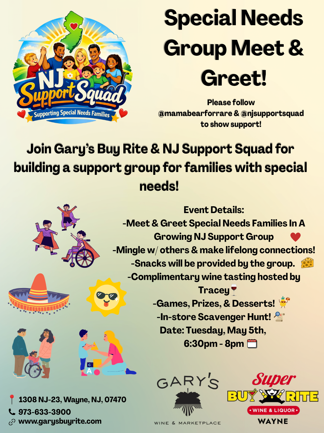 <p></p><p><span><strong><span>Community Spotlight: Special Needs Family Meet & Greet</span></strong></span></p><p><span>We are hosting a special evening for one of NJ’s fastest-growing support groups for families with special needs!</span></p><p><span>On Tuesday, May 5th, from 6:30 PM to 8:00 PM, our store will transform into a space for special needs families to gather, share stories, and build lasting friendships. We’ve got a fantastic lineup to ensure a fun night out.</span></p><p><span>Guests can enjoy a complimentary wine tasting hosted by Tracey, paired with snacks and desserts provided by the group. To keep the energy high, we’re running an in-store scavenger hunt, along with other games and prizes throughout the evening.</span></p><p><span>Whether you’re a member of the group or looking to connect with other local families for the first time, we invite you to stop by and mingle to meet others.</span></p><p><span>This is an event for anyone interested in being part of a support group for special needs, whether you're a family member, a friend, or a caretaker. To be part of the event, email </span><a target="_blank" rel="noopener noreferrer nofollow" href="mailto:rmaya@buyritewines.com"><span>rmaya@buyritewines.com</span></a><span> for more information.</span></p><p><a target="_blank" rel="noopener noreferrer nofollow" href="https://garysbuyrite.com/events/special-needs-support-group-meet-greet-nj-support-squad-garys-buy-rite-tuesday-may-5th-6-30pm-8-00pm-69f20c401d6051004a2e50fa">https://garysbuyrite.com/events/special-needs-support-group-meet-greet-nj-support-squad-garys-buy-rite-tuesday-may-5th-6-30pm-8-00pm-69f20c401d6051004a2e50fa</a></p>