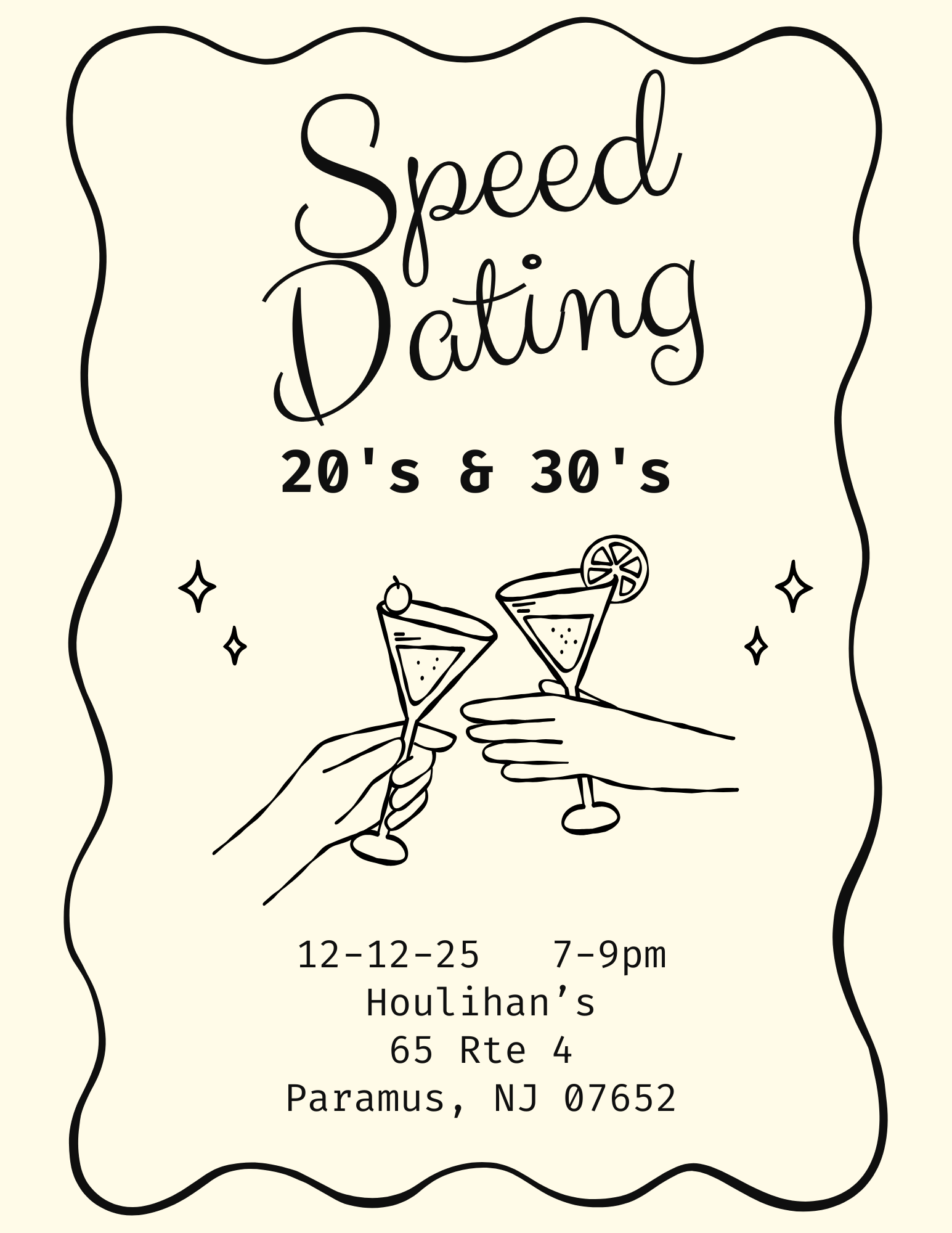 <p><span style="color: rgb(88, 81, 99)"><span>Great love stories don't start in the DMs</span></span></p><p><span>Join us for a lively </span><strong><span>speed dating night</span></strong><span> at Houlihan’s in Paramus! This fun, fast-paced event is designed for singles in their 20s & 30s who want to meet new people face-to-face—no apps, no endless swiping, just real conversations.</span></p><p style="text-align: left"><span>You’ll meet a variety of local singles in quick, fun rounds of </span><strong><span>5-7 minute mini-dates</span></strong><span>. Each time the bell rings, you’ll rotate to meet someone new—no pressure, just a chance to see if sparks fly. At the end of the evening, simply submit your match card, and we’ll handle the rest. If there’s a match, you’ll hear from us the very next day!</span></p><p style="text-align: left"><span>This is </span><strong><span>offline dating at its best</span></strong><span>—relaxed, social, and full of possibility. Whether you’re looking for love, friendship, or just a fun night out, you don’t want to miss this singles event.</span></p><h3 style="text-align: left"><strong><span>How It Works</span></strong></h3><ul><li><p><span>Reserve your ticket early (space is limited!)</span></p></li><li><p><span>Arrive 15 minutes before the event for check-in with our host</span></p></li><li><p><span>Women remain seated while men rotate at the sound of the bell</span></p></li><li><p><span>Each round lasts 5-7 minutes—just enough to break the ice!</span></p></li><li><p><span>Use our match card to take notes about each date</span></p></li><li><p><span>Hand in your match card at the end of the night</span></p></li><li><p><span>Receive your matches by email the following day by noon</span></p></li></ul><p style="text-align: left"><span>It’s easy, engaging, and the best way to experience </span><strong><span>offline dating</span></strong><span> in New Jersey. Whether you’re looking for love or just want to expand your social circle, this event is for you.</span></p><p style="text-align: left"></p><h3 style="text-align: left"><strong><span>The Venue:</span></strong></h3><p style="text-align: left"><span>📍 </span><strong><span>Houlihan’s</span></strong></p><p style="text-align: left"><span>65 E Rt 4, Paramus, NJ 07652</span></p><p style="text-align: left"></p><h3 style="text-align: left"><strong><span>The Host:</span></strong></h3><p style="text-align: left"><span>✨ </span><strong><span>Garden State Connections</span></strong></p><p style="text-align: left"><a target="_blank" rel="noopener noreferrer nofollow" href="https://linktr.ee/gsconnections"><span><u>https://linktr.ee/gsconnections</u></span></a></p>