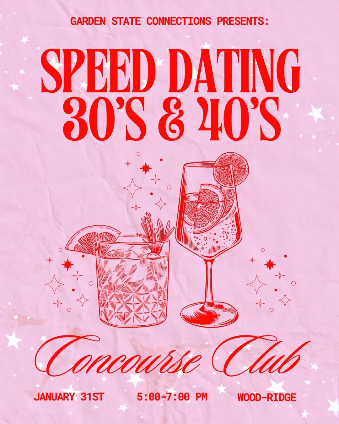 <p><span>Join us for a lively </span><strong><span>speed dating night</span></strong><span> at the Concourse Club in Wood-Ridge! This fun, fast-paced event is designed for singles in their 30s & 40s who want to meet new people face-to-face—no apps, no endless swiping, just real conversations.</span></p><p><span>You’ll meet a variety of local singles in quick, fun rounds of </span><strong><span>5-7 minute mini-dates</span></strong><span>. Each time the bell rings, you’ll rotate to meet someone new—no pressure, just a chance to see if sparks fly. At the end of the evening, simply submit your match card, and we’ll handle the rest. If there’s a match, you’ll hear from us the very next day!</span></p><p><span>This is </span><strong><span>offline dating at its best</span></strong><span>—relaxed, social, and full of possibility. Whether you’re looking for love, friendship, or just a fun night out, you don’t want to miss this singles event.</span></p><p><span></span><strong><span>How It Works</span></strong></p><ul><li><p><span>Reserve your ticket early (space is limited!)</span></p></li><li><p><span>Arrive 15 minutes before the event for check-in with our host</span></p></li><li><p><span>Women remain seated while men rotate at the sound of the bell</span></p></li><li><p><span>Each round lasts 5-7 minutes—just enough to break the ice!</span></p></li><li><p><span>Use our match card to take notes about each date</span></p></li><li><p><span>Hand in your match card at the end of the night</span></p></li><li><p><span>Receive your matches by email the following day by noon</span></p></li></ul><p><span>It’s easy, engaging, and the best way to experience </span><strong><span>offline dating</span></strong><span> in New Jersey. Whether you’re looking for love or just want to expand your social circle, this event is for you.</span></p><p><span></span></p><p><span></span><strong><span>The Venue:</span></strong></p><p><span>📍 </span><strong><span>Concourse Club</span></strong></p><p><span>379 NJ-17 South, Wood-Ridge, NJ 07075</span></p><p><span></span></p><p><span></span><strong><span>The Host:</span></strong></p><p><span>✨ </span><strong><span>Garden State Connections</span></strong></p><p><span></span><a target="_blank" rel="noopener noreferrer nofollow" href="https://linktr.ee/gsconnections"><span>https://linktr.ee/gsconnections</span></a></p>