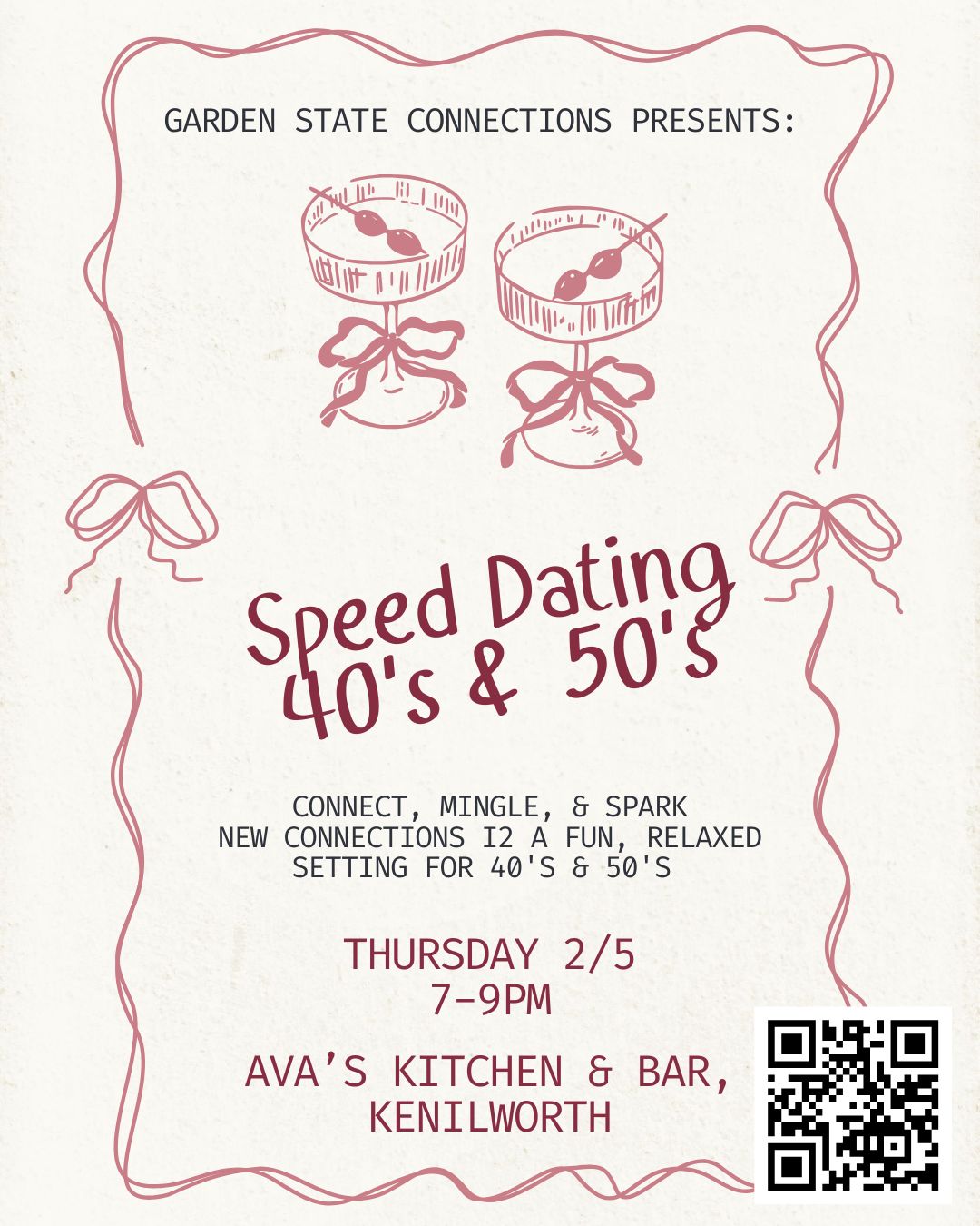 <p><span>Join us for a lively </span><strong><span>speed dating night</span></strong><span> at Ava's Kitchen and Bar in Kenilworth! This fun, fast-paced event is designed for singles in their 40s & 50s who want to meet new people face-to-face—no apps, no endless swiping, just real conversations.</span></p><p><span>You’ll meet a variety of local singles in quick, fun rounds of </span><strong><span>5-7 minute mini-dates</span></strong><span>. Each time the bell rings, you’ll rotate to meet someone new—no pressure, just a chance to see if sparks fly. At the end of the evening, simply submit your match card, and we’ll handle the rest. If there’s a match, you’ll hear from us the very next day!</span></p><p><span>This is </span><strong><span>offline dating at its best</span></strong><span>—relaxed, social, and full of possibility. Whether you’re looking for love, friendship, or just a fun night out, you don’t want to miss this singles event.</span></p><p><span></span><strong><span>How It Works</span></strong></p><ul><li><p><span>Reserve your ticket early (space is limited!)</span></p></li><li><p><span>Arrive 15 minutes before the event for check-in with our host</span></p></li><li><p><span>Women remain seated while men rotate at the sound of the bell</span></p></li><li><p><span>Each round lasts 5-7 minutes—just enough to break the ice!</span></p></li><li><p><span>Use our match card to take notes about each date</span></p></li><li><p><span>Hand in your match card at the end of the night</span></p></li><li><p><span>Receive your matches by email the following day</span></p></li></ul><p><span>It’s easy, engaging, and the best way to experience </span><strong><span>offline dating</span></strong><span> in New Jersey. Whether you’re looking for love or just want to expand your social circle, this event is for you.</span></p><p><span></span></p><p><span></span><strong><span>The Venue:</span></strong></p><p><span>📍 </span><strong><span>Ava's Kitchen & Bar</span></strong></p><p><span>1 N 21st St, Kenilworth, NJ 07033</span></p><p><span></span></p><p><span></span><strong><span>The Host:</span></strong></p><p><span>✨ </span><strong><span>Garden State Connections</span></strong></p><p><span></span><a target="_blank" rel="noopener noreferrer nofollow" href="https://linktr.ee/gsconnections"><span>https://linktr.ee/gsconnections</span></a></p>