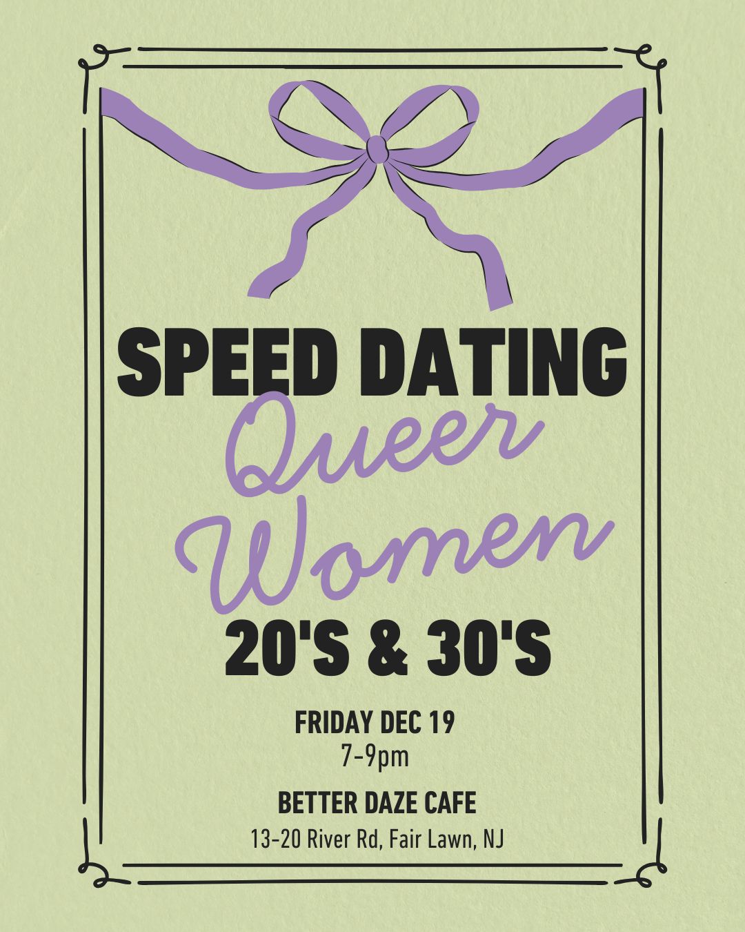 <p><span>Get ready to mix, mingle, and maybe find your match at our speed dating event tailored for queer women in their 20s and 30s!</span></p><p><span>Join us for a vibrant </span><strong><span>speed dating night </span></strong><span>just for queer women in their 20s & 30s at the cozy, queer-women-owned Better Daze Cafe in Fair Lawn!</span></p><p><span>This fun, fast-paced evening is all about creating genuine connections face-to-face—no apps, no endless swiping, just real conversations in a safe, welcoming space.</span></p><p><span>You’ll meet a variety of local queer women through quick, engaging rounds of </span><strong><span>5–7 minute mini-dates</span></strong><span>. Each time the bell rings, you’ll rotate and meet someone new—no pressure, just a chance to see if sparks fly. At the end of the night, simply hand in your match card, and if there’s a mutual connection, we’ll let you know the very next day!</span></p><p><span>Whether you’re looking for love, friendship, or simply a fun night out with amazing queer women, this event is about </span><strong><span>building connections that matter.</span></strong></p><h3><strong><span>How It Works</span></strong></h3><ul><li><p><span>Reserve your ticket early (space is limited!)</span></p></li><li><p><span>Arrive 15 minutes before the event for check-in with our host</span></p></li><li><p><span>Participants rotate at the sound of the bell to meet someone new</span></p></li><li><p><span>Each round lasts 5–7 minutes—just enough to break the ice!</span></p></li><li><p><span>Use our match card to jot down notes about each date</span></p></li><li><p><span>Hand in your match card at the end of the night</span></p></li><li><p><span>Receive your matches by email the next day</span></p></li></ul><p><span>It’s easy, engaging, and one of the best ways to experience offline dating in New Jersey.</span></p><p></p><h3><strong><span>The Venue</span></strong></h3><p><span>📍 </span><strong><span>Better Daze Cafe</span></strong><span><br>13-20 River Rd, Fair Lawn, NJ 07410<br>✨ Proudly owned and operated by queer women</span></p><p></p><h3><strong><span>The Host</span></strong></h3><p><span>🌟 </span><strong><span>Garden State Connections</span></strong><span><br></span><a target="_blank" rel="noopener noreferrer nofollow" href="https://linktr.ee/gsconnections"><span><u>https://linktr.ee/gsconnections</u></span></a></p>