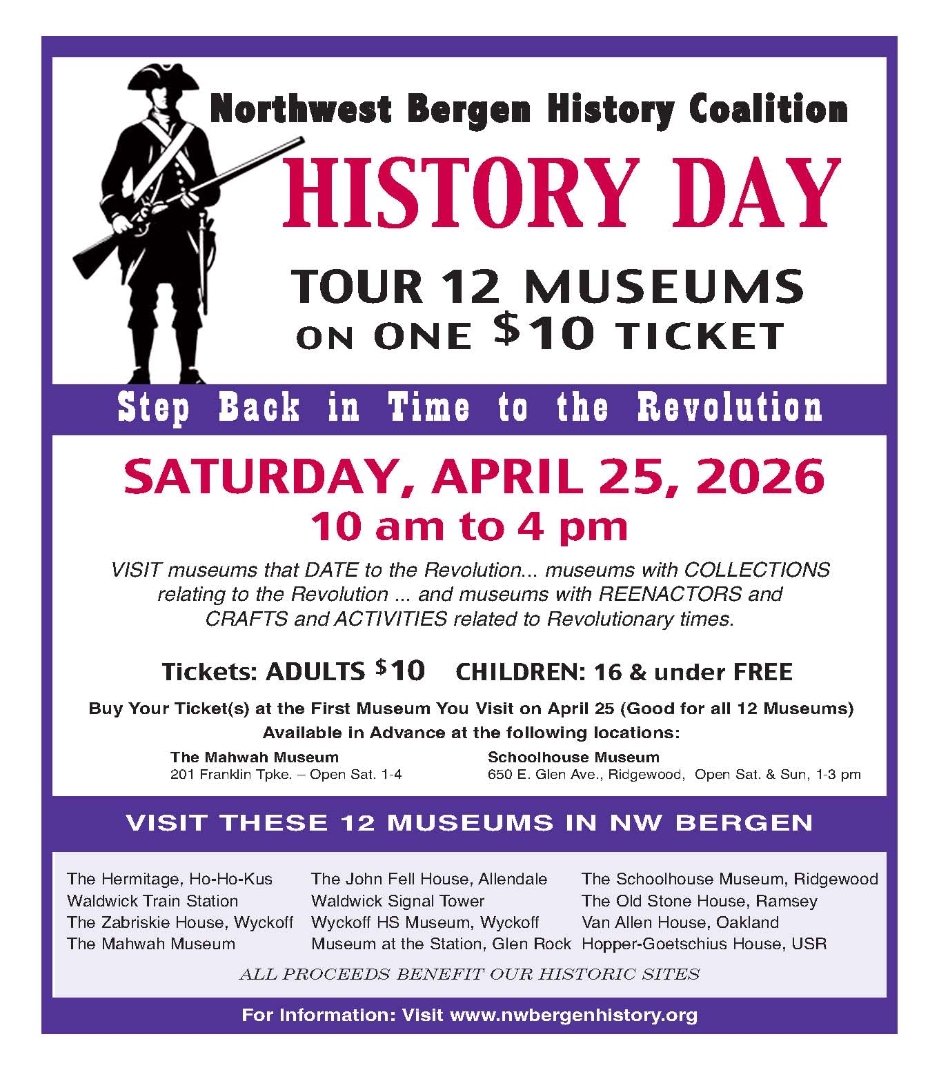 <p><span>Stop by the Mahwah Museum this History Day!</span></p><p style="text-align: left"><span>The Northwest Bergen History Coalition is hosting its annual History Day on April 25th. With the purchase of one $10 ticket, you can visit up to twelve museums across Northwest Bergen Towns. </span></p><p style="text-align: left"><span>The Mahwah Museum features five exhibits plus the popular DC Model Railroad (lower level). Now on view, “The Gilded Age in the Ramapo Valley,” with historical maps, period costumes, photographs, and rare artifacts. “Somewhere in Fardale” shows early 20th c. HoHokus Township and Mahwah’s early neighborhood life, firemen, farming, and family genealogy. “Fardale in Flight” and “Metal Works in Motion” feature kinetic sculptures by Warren Storms. See his hand-made hang glider that flew in Mahwah! “The World of Model Trains” features a working G-Scale model train, vintage Lionel trains, and historical train memorabilia. Revolution 250 displays Robert Erskine’s 1778 Survey of the Ramapo Valley. Colonial costume replicas, and maps of 8 Revolutionary battles in NJ. The permanent “Les Paul and Mary Ford in Mahwah” features newly displayed garments and an 8-track recording console from the Les Paul house. Added photographs and timelines of the pair’s career, along with framed special Gibson Les Paul guitars on display.</span></p><p style="text-align: left"><span>Other participating museums include: The Hermitage, Ho-Ho-Kus | Waldwick Train Station | The Zabriskie House, Wyckoff | Mahwah Museum, Mahwah | |The John Fell House, Allendale | Waldwick Signal Tower, Waldwick | Wyckoff Historical Society Museum | Museum at the Station, Glen Rock | The Schoolhouse Museum, Ridgewood | The Old School House, Ramsey | Van Allen House, Oakland | Hopper-Goetschius House, Upper Saddle River </span></p><p style="text-align: left"><span>Tickets can be purchased at the door, or you can pick up your tickets early at the Mahwah Museum (201 Franklin Turnpike) or Schoolhouse Museum (650 E. Glen Ave., Ridgewood), starting on April 1st. Children 16 & Under: Free. </span></p>