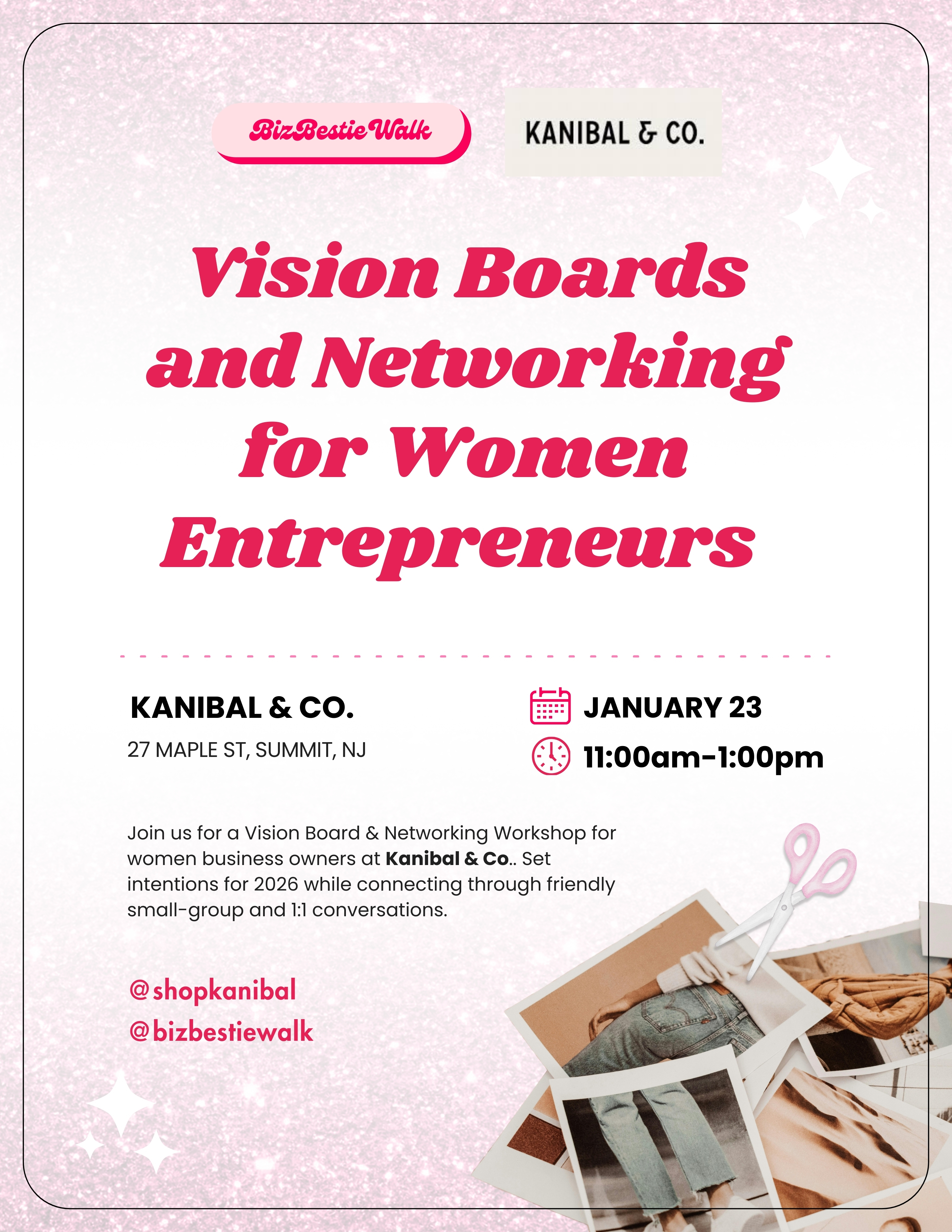 <p>Join us at Kanibal & Co. in Summit, NJ for a creative, connection-focused workshop designed for women business owners. You’ll create a 10×10 canvas vision board while enjoying structured, introvert-friendly networking.<strong> </strong>BizBestie Walk events are designed for real conversation—no pressure to pitch or speak in front of a crowd.</p><h3>What’s Included</h3><p>• All materials + guided instruction<br>• Gentle networking woven into the experience<br>• Optional follow-up email to stay connected<br>• Invitation to our private BizBestie Walk Facebook group</p><p>Limited to 16 attendees to ensure a warm, high-quality experience.<br>Food not included — BYO snacks & drinks welcome.</p><h3>Who’s Invited</h3><p>Women entrepreneurs, founders, freelancers, solopreneurs, and side-hustlers at any stage.</p><h3>Your Host</h3><p>Sharon Calle, founder of BizBestie Walk & Luminosa Creative</p><p>🎟 <strong>Spots are limited. We can’t wait to connect with you.</strong> ✨</p>