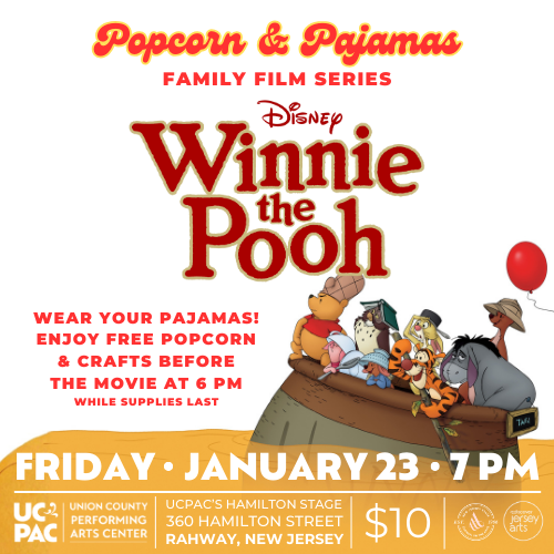 <p><span><span>Come have fun and make memories your family will cherish at Popcorn & Pajamas! This January, UCPAC is featuring 2011’s “Winnie the Pooh,” starring everyone’s favorite willy nilly silly ole bear and his friends from the Hundred Acre Wood. The gang goes on an adventure searching for Eeyore’s lost tail and trying to rescue Christopher Robin from a mysterious creature known as the Backson.<br><br>True to the look and spirit of the original films, featuring hand-drawn animation and heartwarming moments, “Winnie the Pooh,” like honey, is a sweet treat for kids of all ages! Doors: 6 PM – Before the movie, have a seat at our craft table and make something fun to take home!<br>Film: 7 PM </span><strong><span>Free popcorn and crafts available while supplies last</span></strong><span><br>UCPAC’s Popcorn & Pajamas Film Series is a digital presentation.</span></span></p>