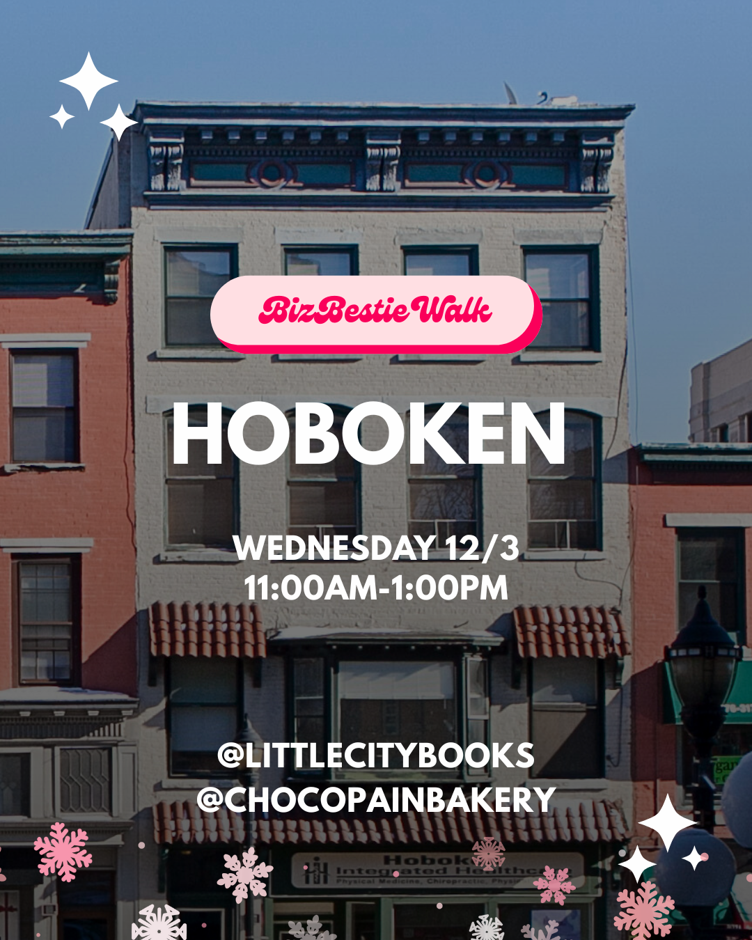 <p><span style="color: rgb(0, 0, 0)"><span>Join BizBestie Walk for a networking walk + coffee meetup for women entrepreneurs in Hoboken on 12/3. Meet female business owners, enjoy scenic waterfront views, and stroll through one of NJ’s most charming downtowns while growing your biz. Visit women-owned Little City Books and Choc O Pain Bakery.</span></span></p>