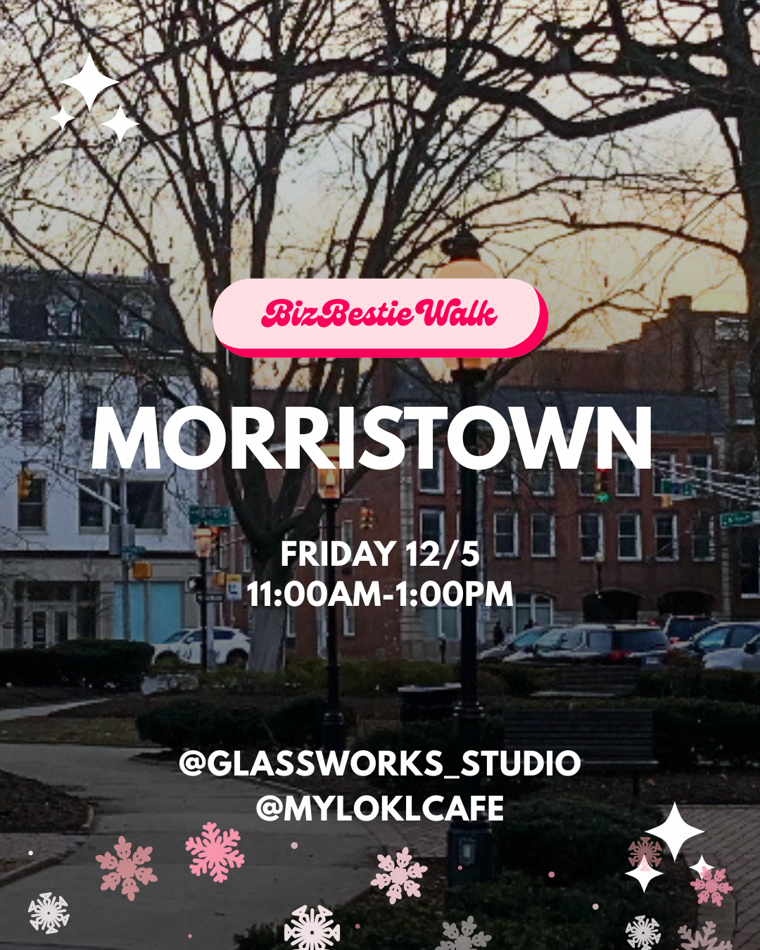 <p><span style="color: rgb(0, 0, 0)"><span>Join BizBestie Walk for a networking walk + coffee meetup for women entrepreneurs in Morristown on 12/5. Stroll through one of NJ’s most charming downtowns while connecting with female business owners and growing your network. Visit Glassworks Studio and Lokl Cafe.</span></span></p>