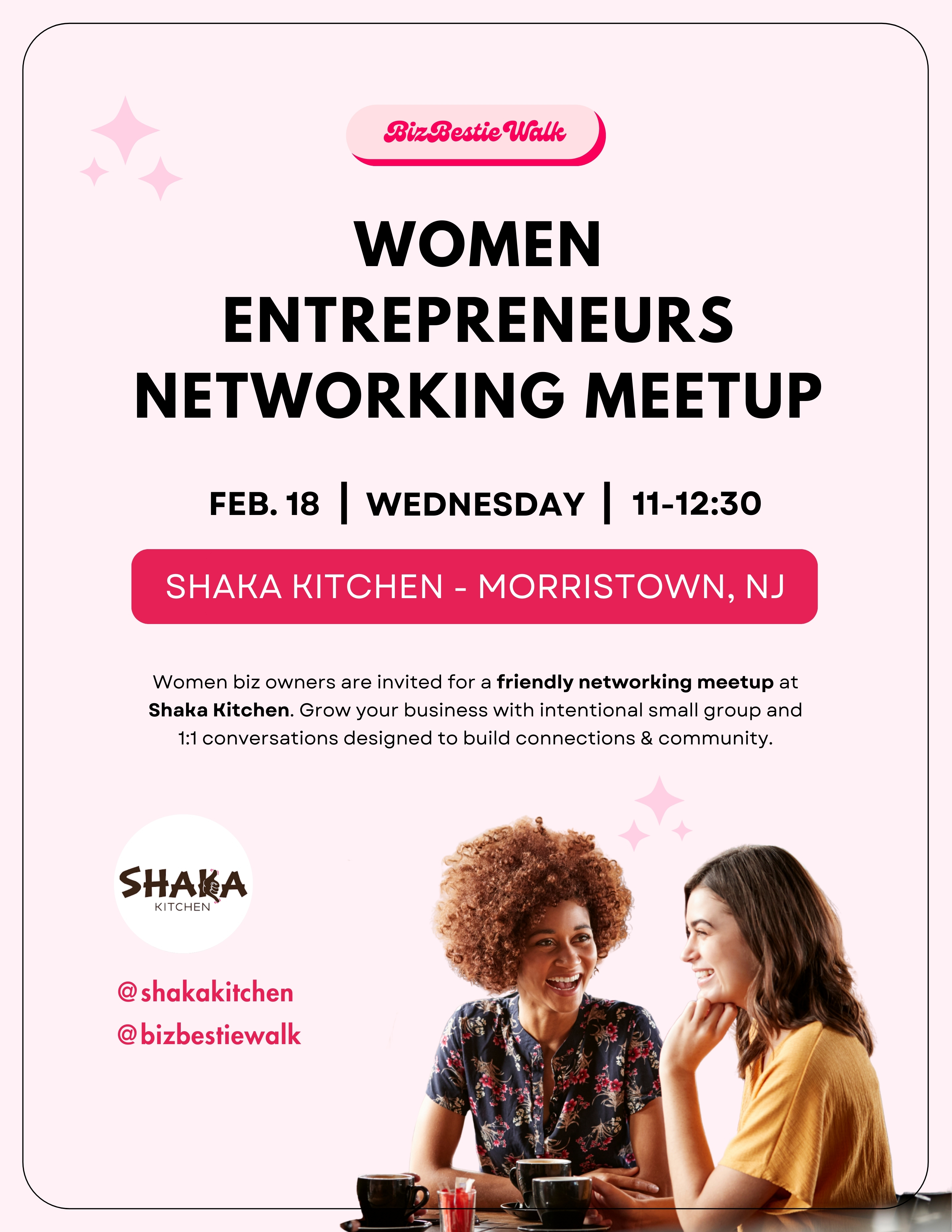 <p><span>Join us for an in-person </span><a target="_blank" rel="noopener noreferrer nofollow" href="https://www.bizbestiewalk.com/"><span>BizBestie Walk</span></a><span> networking meetup at Shaka Kitchen in Morristown, NJ designed for meaningful, low-pressure connection with fellow women entrepreneurs. Expect structured networking, small-group conversation, and relaxed 1:1 chats that make it easy to meet new BizBesties. BizBestie Walk is designed for real conversation — no pressure to pitch or speak in front of a crowd.</span></p><h3><strong><span>What’s Included</span></strong></h3><p><span>• Thoughtfully sized networking meetup<br>• Guided small-group + 1:1 conversations<br>• A welcoming, introvert-friendly environment</span></p><p><span>Note</span><strong><span>:</span></strong><span> Food is </span><em><span>not</span></em><span> included. As a thank-you to Shaka Kitchen, each attendee is asked to make a purchase. Arrive 10–15 minutes early to order.</span></p><h3><strong><span>Who’s Invited</span></strong></h3><p><span>Women business owners, solopreneurs, freelancers, founders, and side-hustlers at any stage.</span></p><h3><strong><span>What to Expect</span></strong></h3><p><span>• Small-group connection<br>• 1:1 networking chats<br>• Open networking<br>• Optional Instagram + community follow-up</span></p><h3><strong><span>Hosted By</span></strong></h3><p><span>Sharon Calle — Founder of BizBestie Walk & Luminosa Creative</span></p><p><span>🎟 Spots are limited. We can’t wait to connect with you. ✨</span></p>