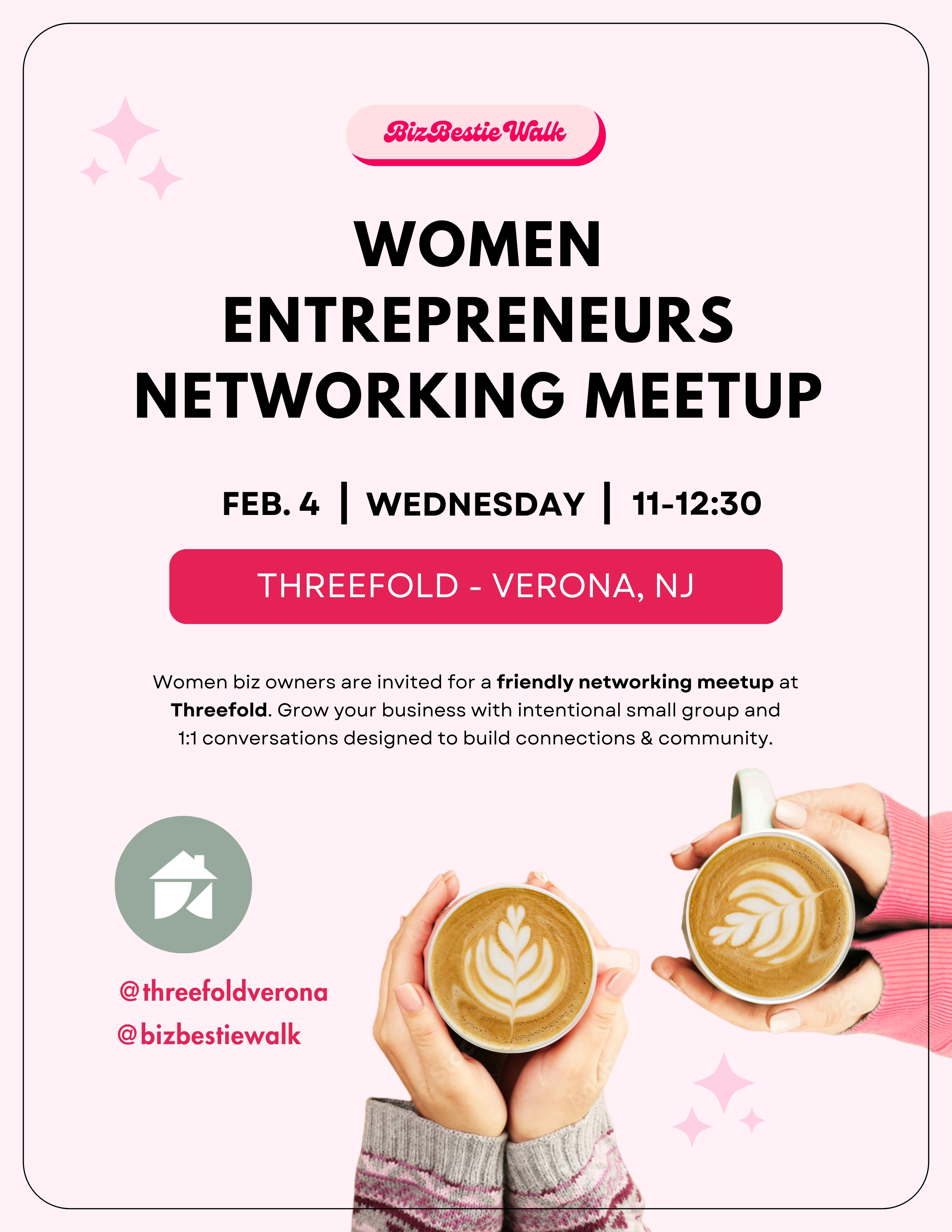 <p><span>Join us for an in-person </span><a target="_blank" rel="noopener noreferrer nofollow" href="https://www.bizbestiewalk.com/"><span>BizBestie Walk</span></a><span> networking meetup at Threefold in Verona, NJ designed for meaningful, low-pressure connection with fellow women entrepreneurs. Expect structured networking, small-group conversation, and relaxed 1:1 chats that make it easy to meet new BizBesties. BizBestie Walk is designed for real conversation — no pressure to pitch or speak in front of a crowd.</span></p><h3><strong><span>What’s Included</span></strong></h3><p><span>• Thoughtfully sized networking meetup<br>• Guided small-group + 1:1 conversations<br>• A welcoming, introvert-friendly environment</span></p><p><span>Note</span><strong><span>:</span></strong><span> Food is </span><em><span>not</span></em><span> included. As a thank-you to Threefold, each attendee is asked to make a purchase. Arrive 10–15 minutes early to order.</span></p><h3><strong><span>Who’s Invited</span></strong></h3><p><span>Women business owners, solopreneurs, freelancers, founders, and side-hustlers at any stage.</span></p><h3><strong><span>What to Expect</span></strong></h3><p><span>• Small-group connection<br>• 1:1 networking chats<br>• Open networking<br>• Optional Instagram + community follow-up</span></p><h3><strong><span>Hosted By</span></strong></h3><p><span>Sharon Calle — Founder of BizBestie Walk & Luminosa Creative</span></p><p><span>🎟 Spots are limited. We can’t wait to connect with you. ✨</span></p>