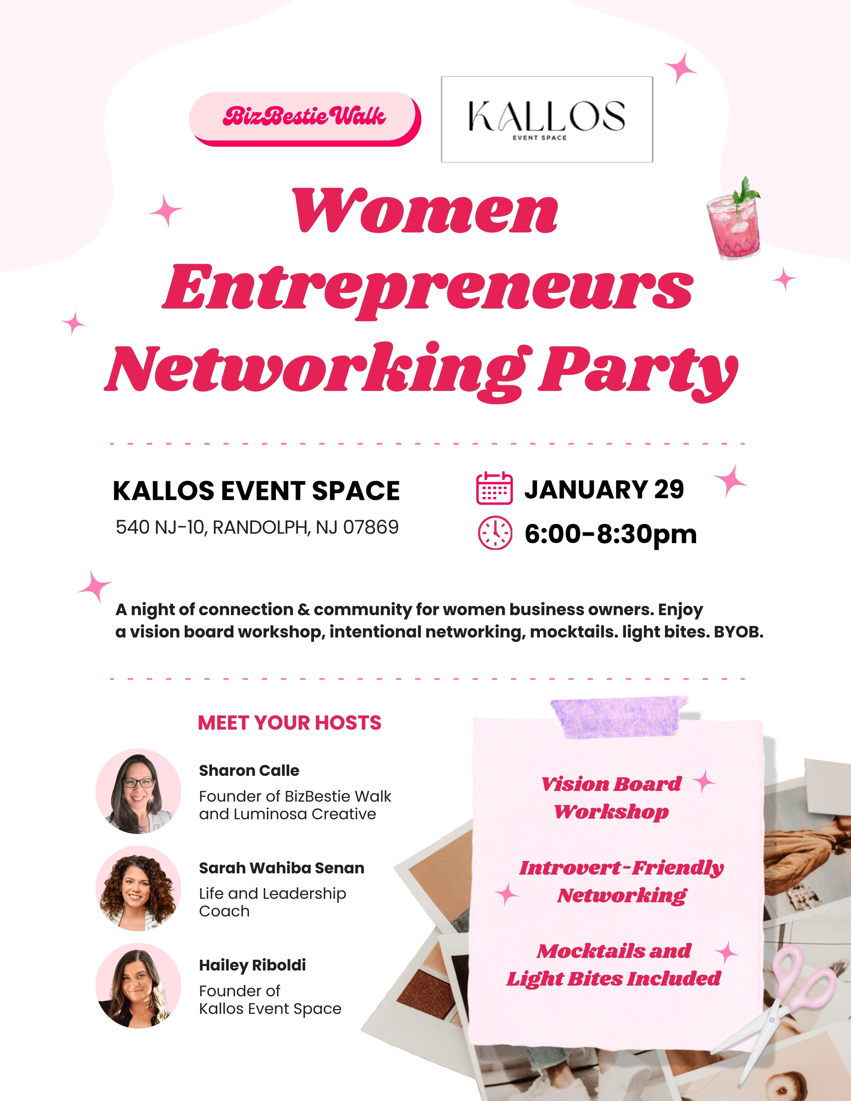 <p>Join BizBestie Walk for an intentional evening of connection, creativity, and community with local women business owners. This curated event blends meaningful conversation with a guided vision board workshop. Ages 21+ BYOB welcome</p><h3>Who’s Invited</h3><p>Women business owners, solopreneurs, side-hustlers, freelancers, and founders looking to build real-life connections.</p><h3>What to Expect</h3><p>• Guided vision board workshop<br>• Structured, introvert-friendly networking<br>• A warm, community-first vibe</p><h3>What’s Included</h3><p>• All materials for a 10x10 canvas vision board<br>• Guided prompts + facilitation<br>• Mocktails & light bites (BYOB welcome)</p><p>We’ll also share Instagram handles after the event so you can stay connected. Guests are invited to join our private BizBestie Walk Facebook group.</p><p>Limited to 30 attendees for a high-quality experience.<br>Come solo. Leave with biz besties. ✨</p><h3>Venue</h3><p><strong>Kallos Event Space</strong> — a women-owned venue created for elevated gatherings. Free parking available.</p><h3>Your Hosts</h3><p>Sharon Calle — Founder, BizBestie Walk & Luminosa Creative<br>Sarah Wahiba Senan — Life & Leadership Coach<br>Hailey Riboldi — Founder, Kallos Event Space</p>